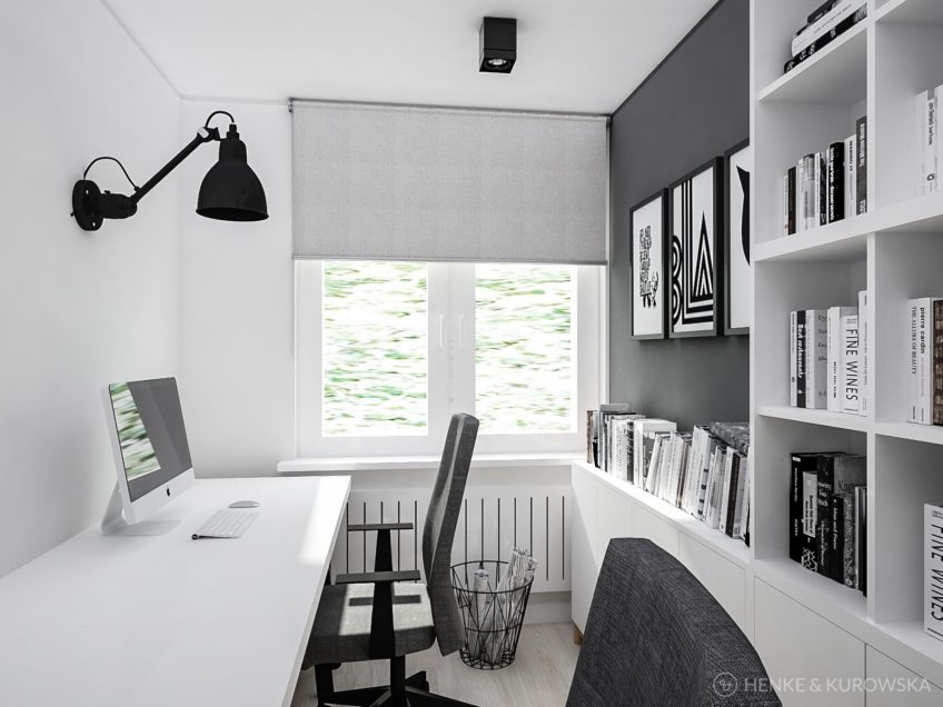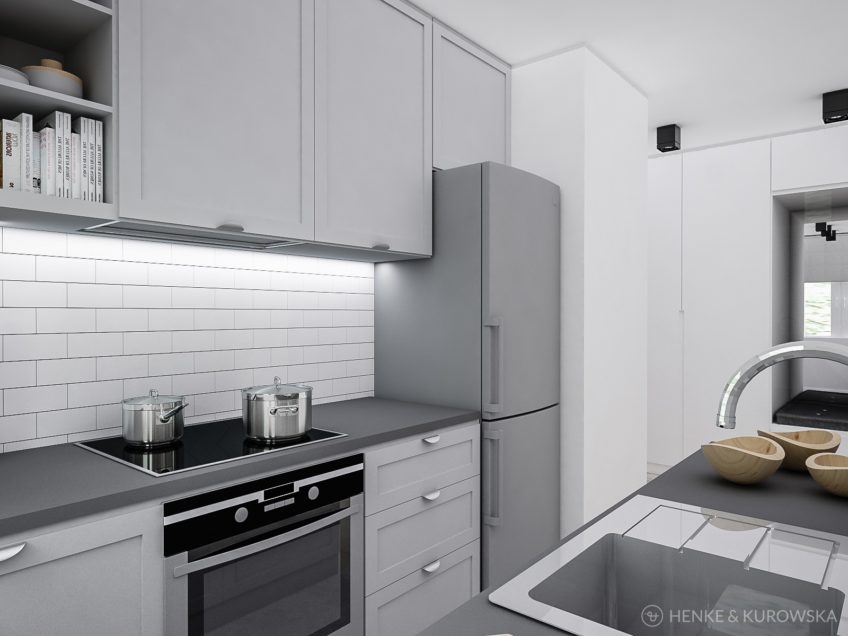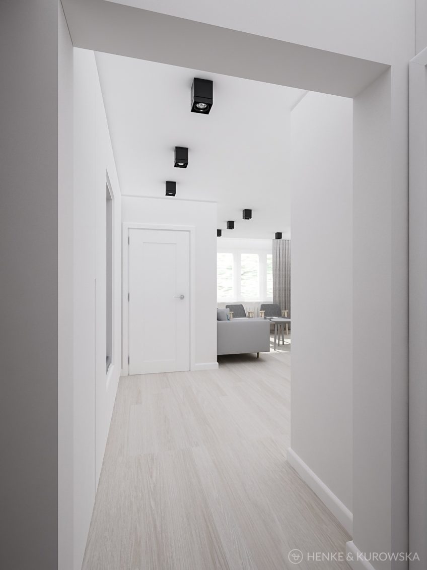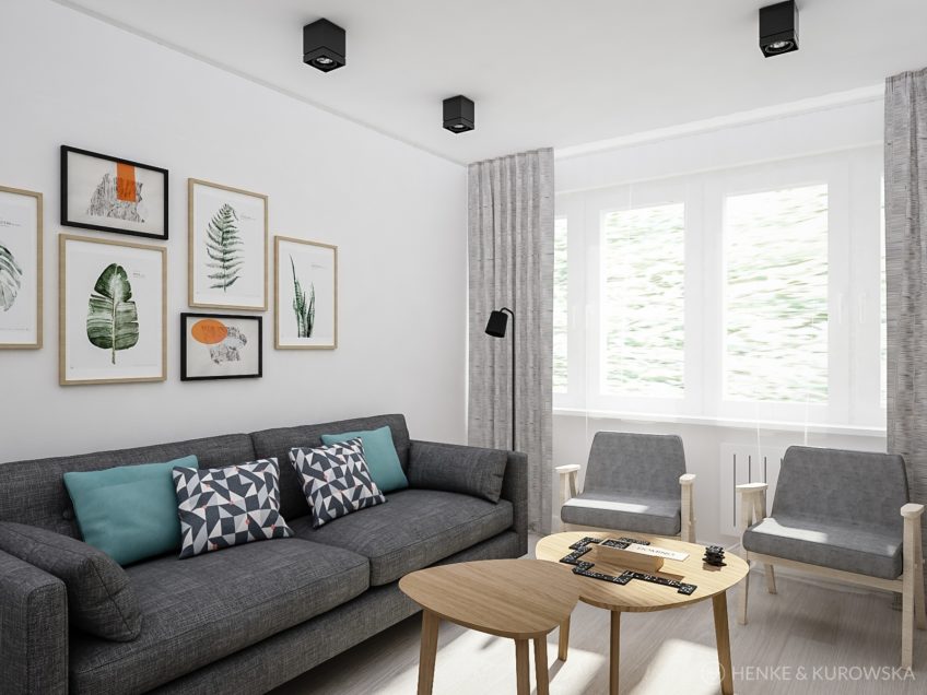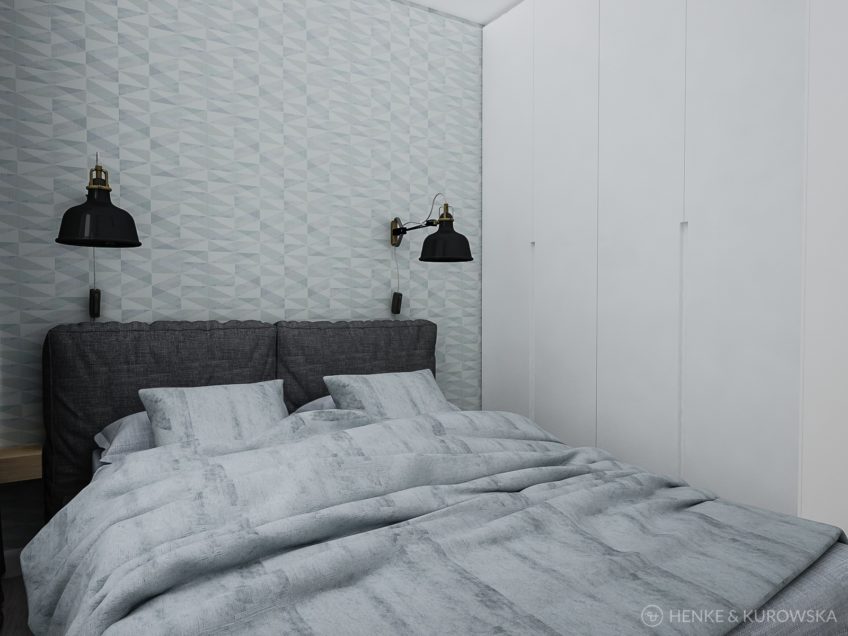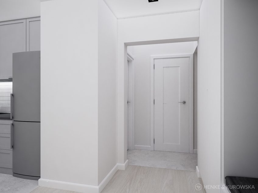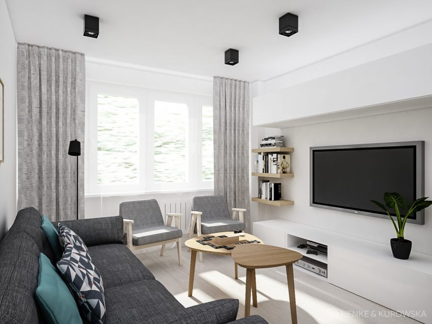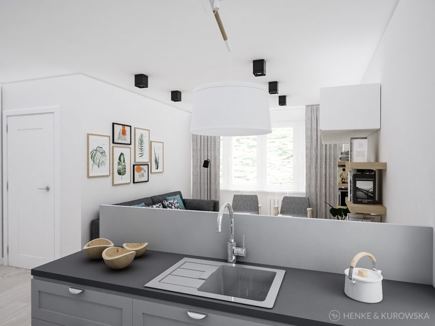 Projekt zakładający kompletny remont mieszkania w bloku rama H. Kolorystyka utrzymana jest w bieli i szarości, zaakcentowana czarnymi oprawami świetlnymi. Kolor delikatnie wprowadzony jest w niebieskich elementach, jak tapeta, krzesło czy dodatki. Wydawało by się, że wnętrze z założenia będzie zimne i surowe, dlatego dla ocieplenia klimatu pojawia się trochę elementów drewnianych.