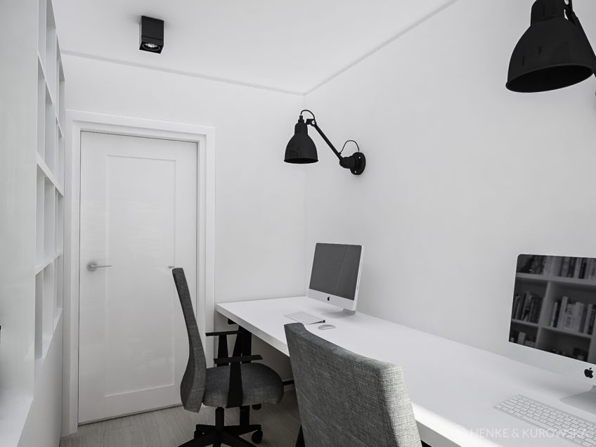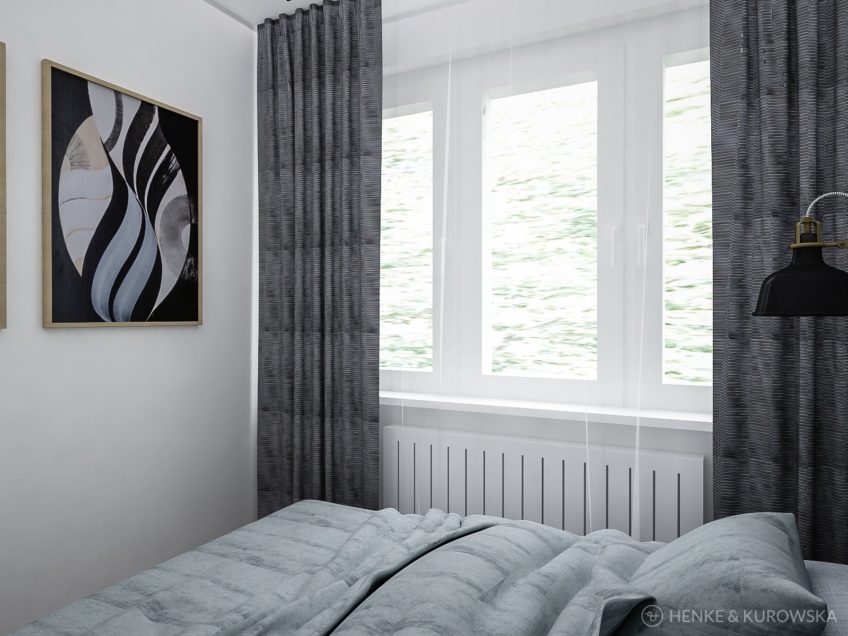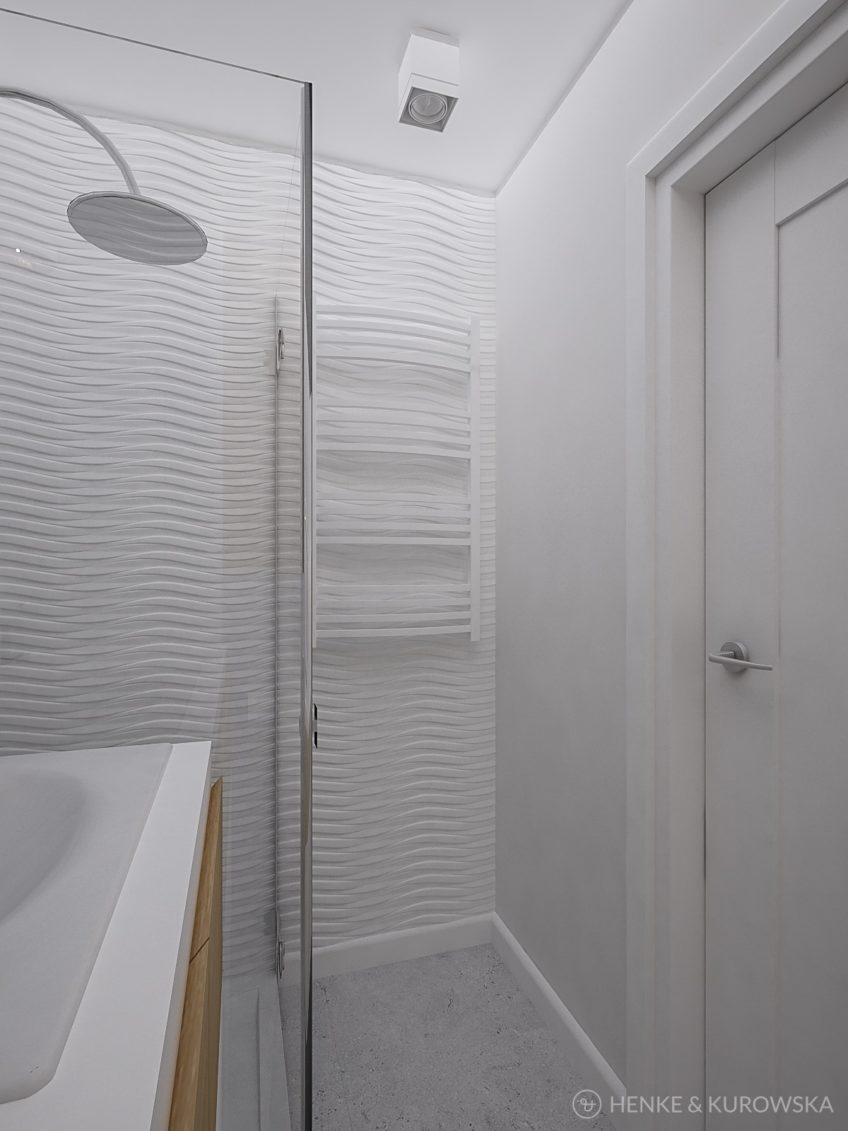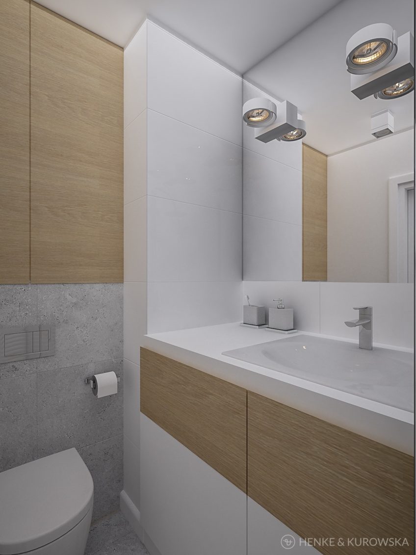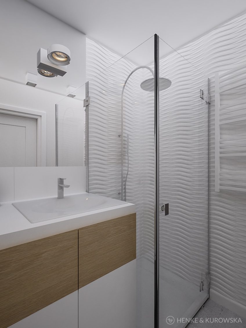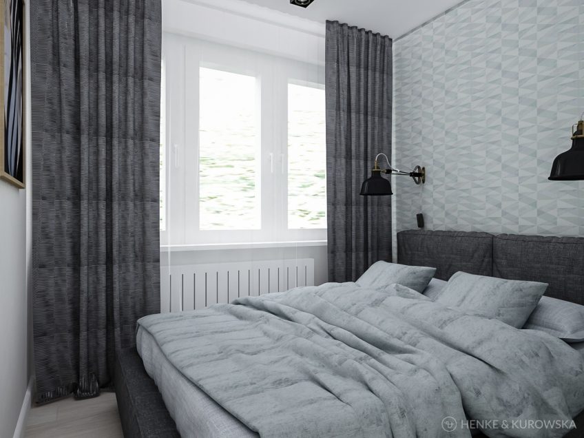 Projekt zakładający kompletny remont mieszkania w bloku rama H. Kolorystyka utrzymana jest w bieli i szarości, zaakcentowana czarnymi oprawami świetlnymi. Kolor delikatnie wprowadzony jest w niebieskich elementach, jak tapeta, krzesło czy dodatki. Wydawało by się, że wnętrze z założenia będzie zimne i surowe, dlatego dla ocieplenia klimatu pojawia się trochę elementów drewnianych.