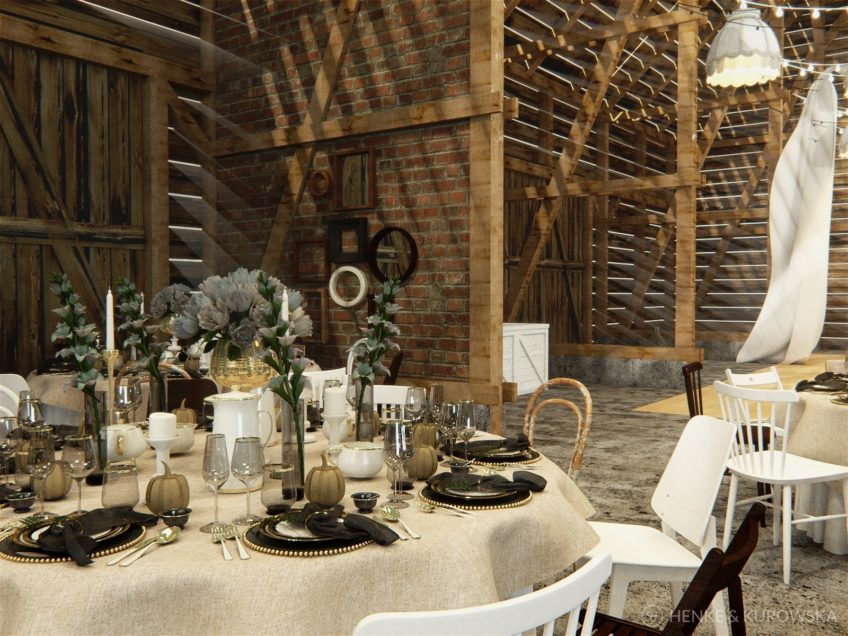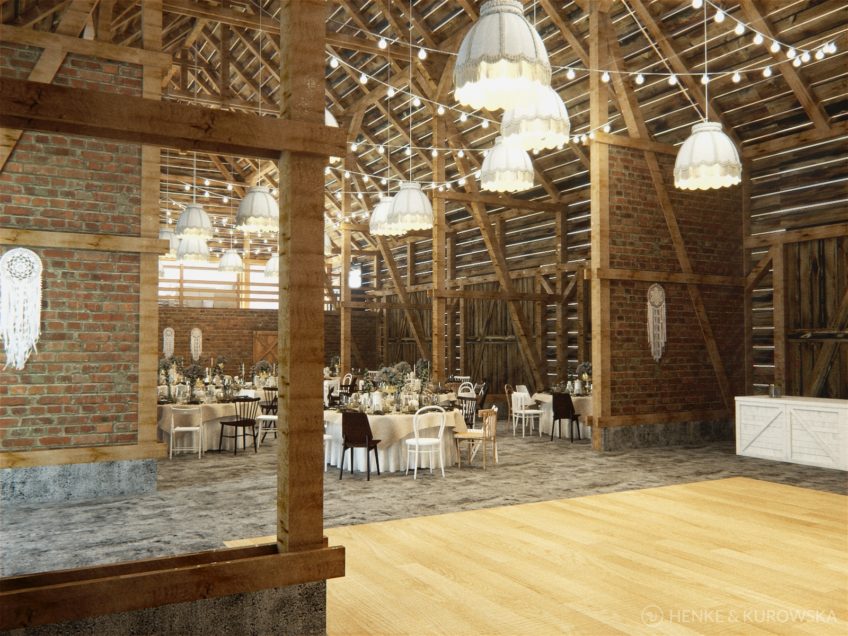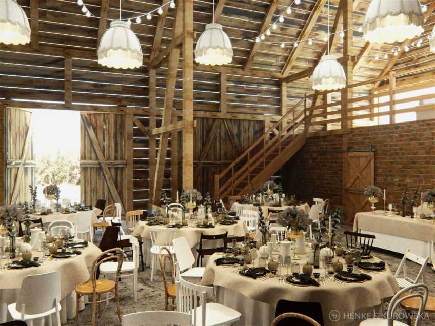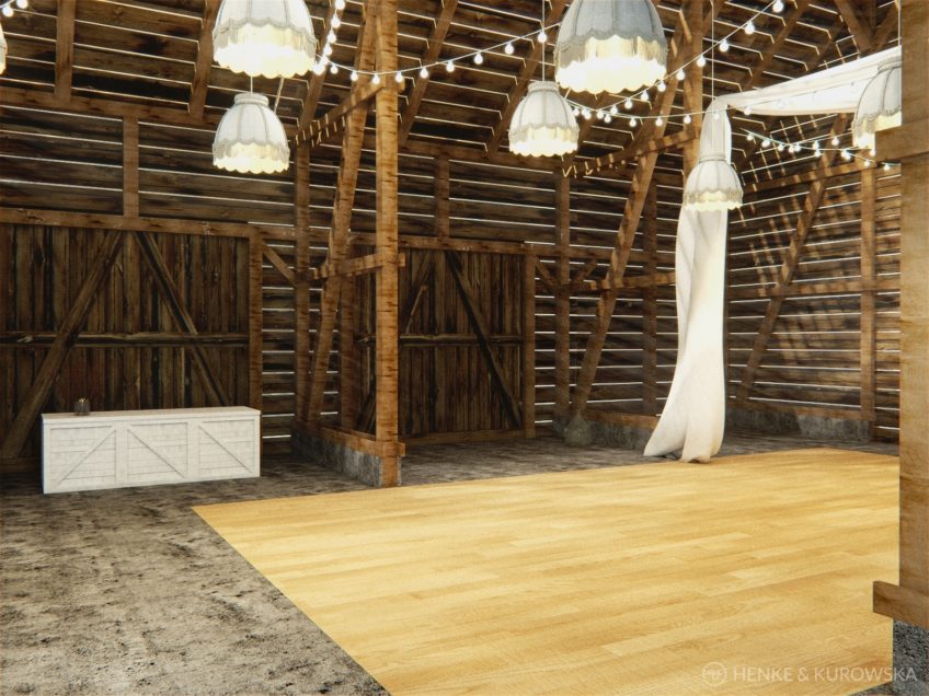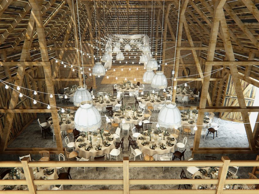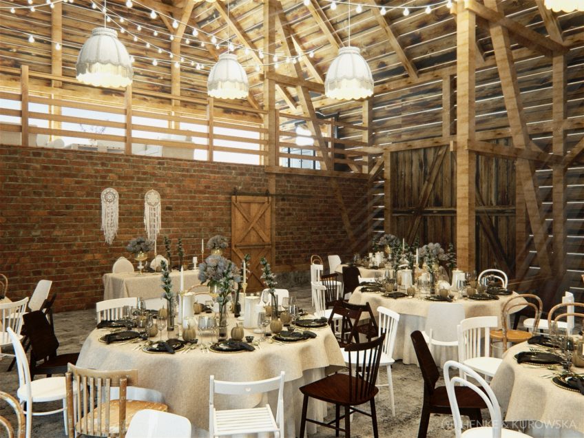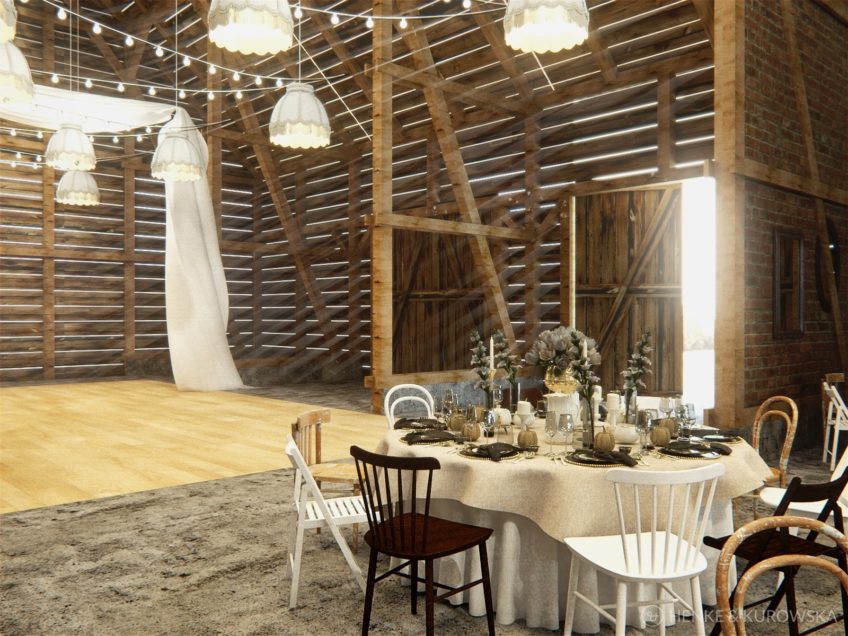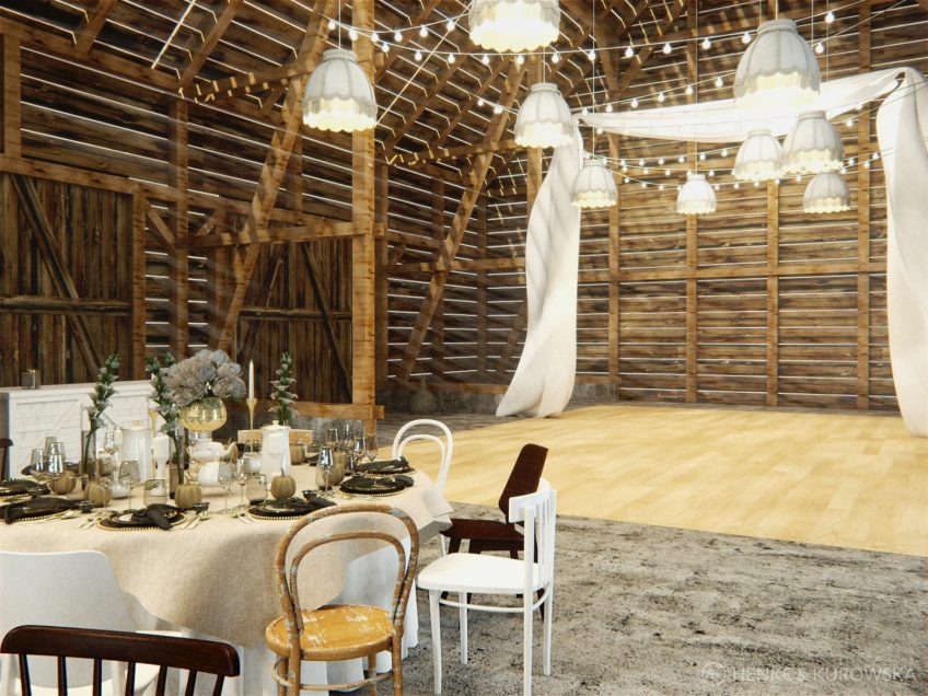 Wizualizacje projektu modernizacji i wystroju starej stodoły dla Sielskiej Republiki na potrzeby organizowania przyjęć oraz wesel.