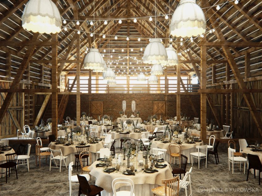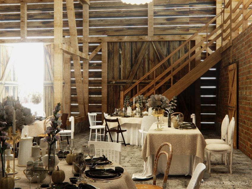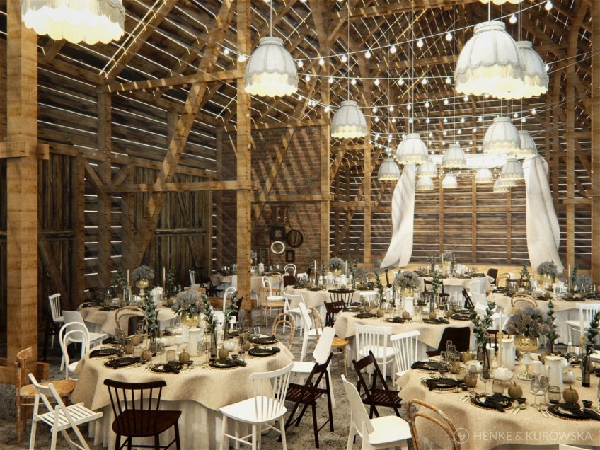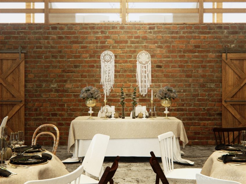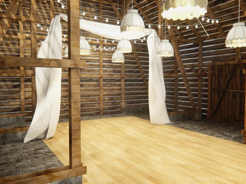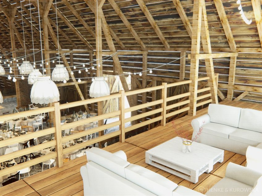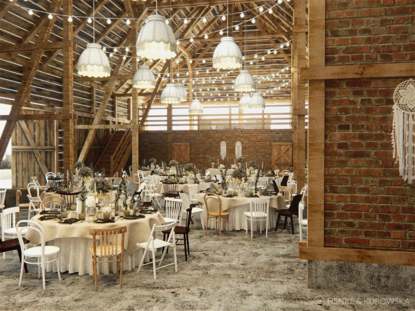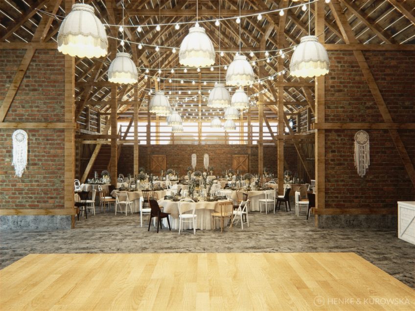 Wizualizacje projektu modernizacji i wystroju starej stodoły dla Sielskiej Republiki na potrzeby organizowania przyjęć oraz wesel.