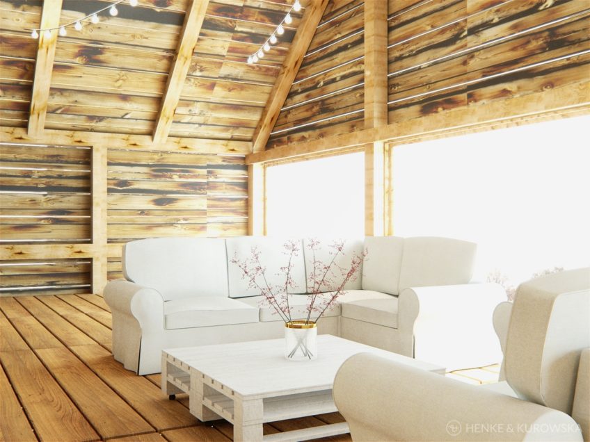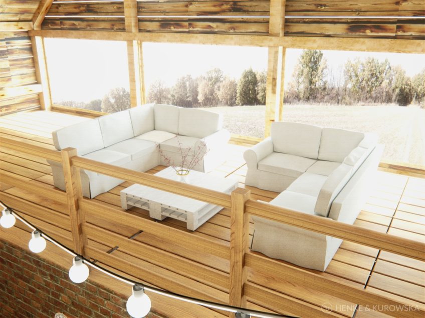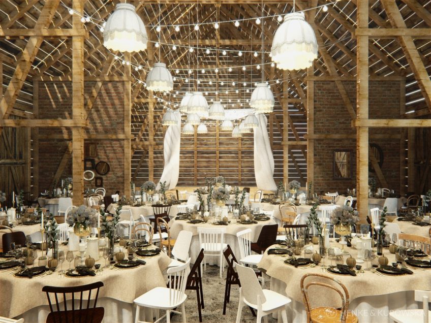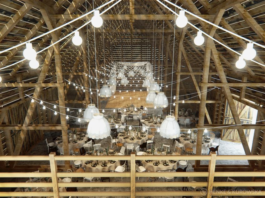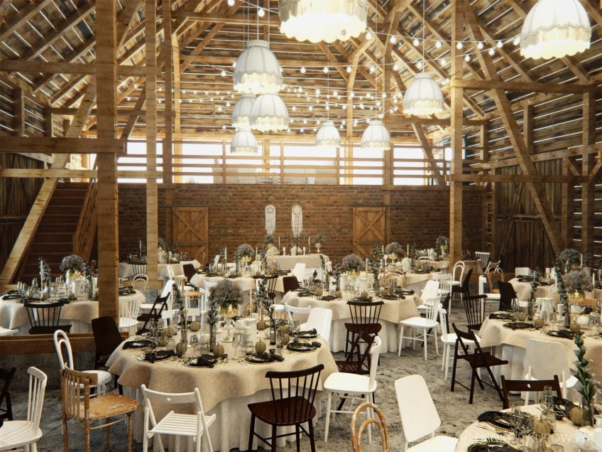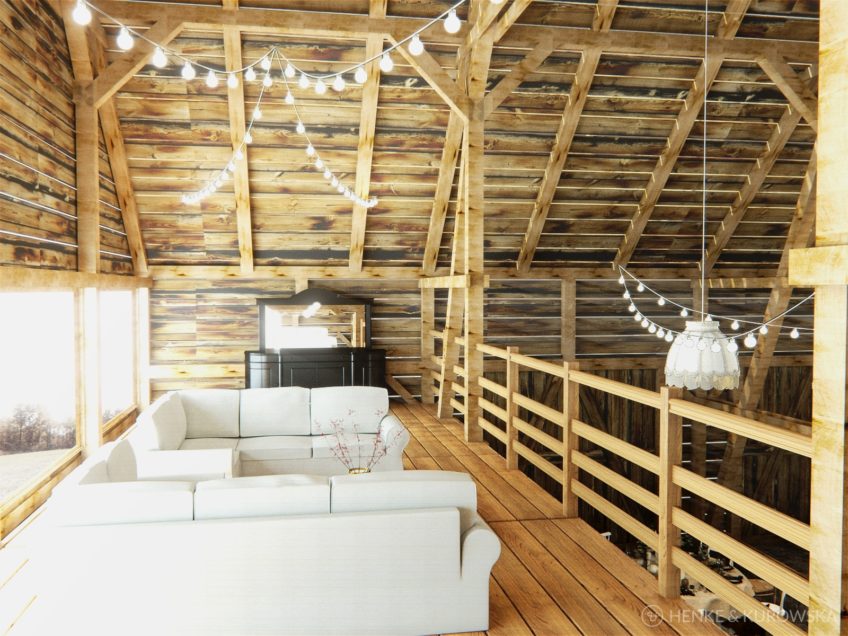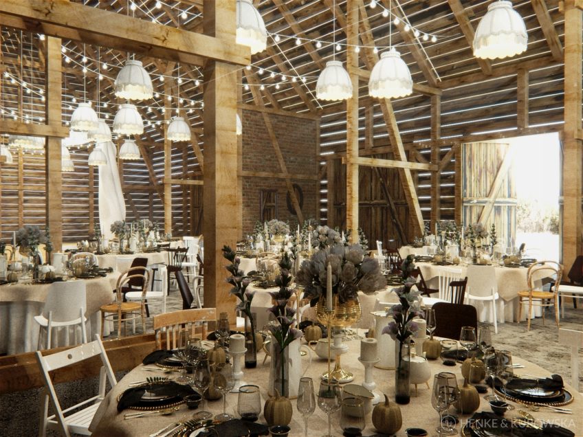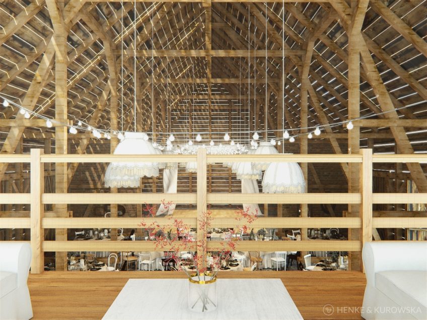 Wizualizacje projektu modernizacji i wystroju starej stodoły dla Sielskiej Republiki na potrzeby organizowania przyjęć oraz wesel.